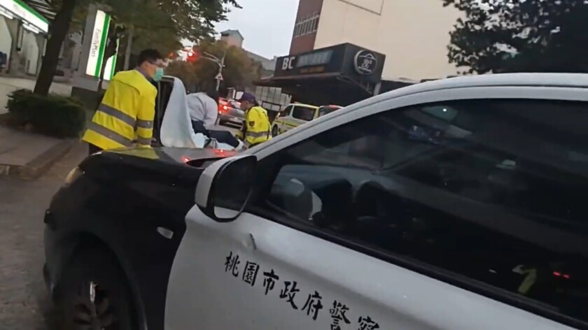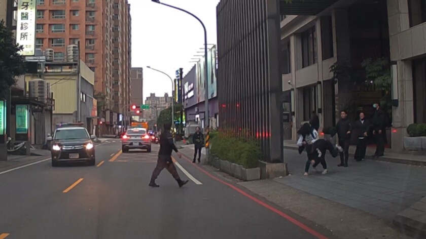張姓女子回到社區大門口對男友一計過肩摔,差點害男友被趕到的警車撞上。